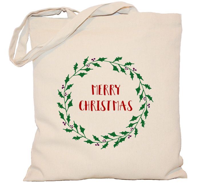 Torba świąteczna z nadrukowanym wieńcem ułożonych z zielonych gałązek.