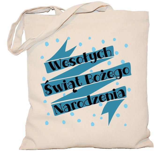 Torba świąteczna ze wstęgą i życzeniami świątecznymi.