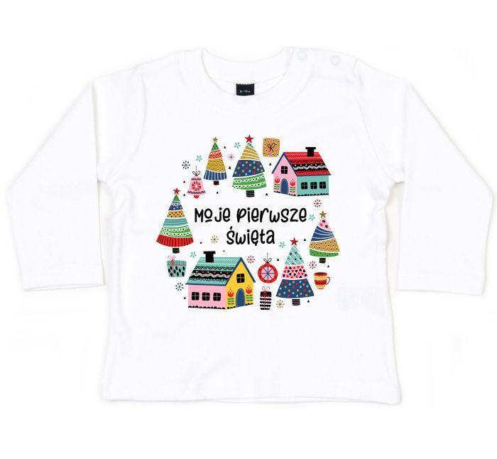 Bluzka Moje Pierwsze Święta ma bardzo kolorową grafikę. Znajdziemy tu domki i choinki o bardzo wzorzystym projekcie. Całość ma charakter świąteczny i kojarzy się z gwiazdką.