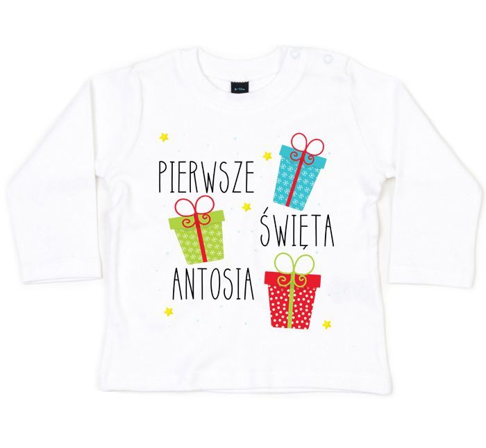 Bluzka Pierwsze Święta z imieniem dziecka oraz kolorowymi prezentami jest idealną propozycją dla chłopca. Koniecznie podaj imię.