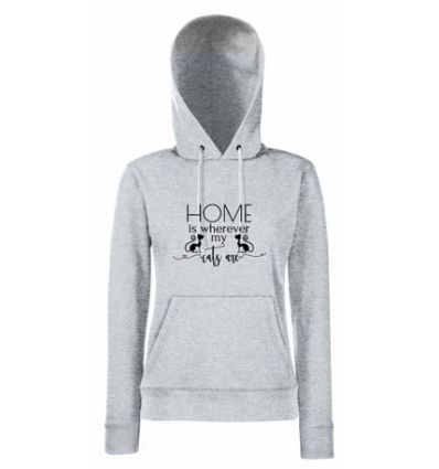 Bluza damska z kapturem Home is wherever my cats are jest przygotowana dla posiadaczek kotków. Oczywiście jest to trochę przerobiony napis z innego powiedzenia. Ale ponieważ można je łatwo modyfikować. Oszalałaś na punkcie swojego kota? Ta bluza jest dla ciebie. Nie odpowiada Ci model, napisz jakiego poszukujesz.