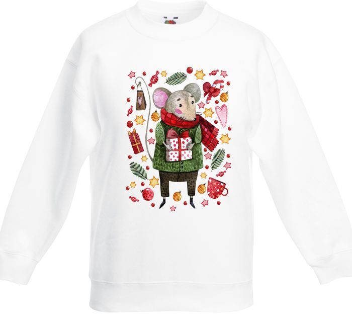 Ciepła bluza dziecięca z nadrukiem Pan Myszka. Dookoła postaci są umieszczone świąteczne przedmioty. Pan Myszka jest ubrany zieloną kurteczkę i brązowe spodnie. Otulony jest w czerwony szalik w kratę. W rękach trzyma prezent owinięty w biały papier prezentowy w czerwone kropki i wielką kokardą.