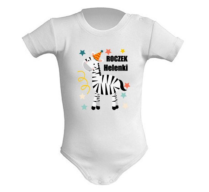 Body na roczek z zebrą i imieniem dziecka. Zebra ma ochotę na zabawę. Założyła urodzinową czapeczkę i porozrzucała gwiadkowe konfetti oraz serpentyny. To będą super urodziny. Zebra ma swój własny styl i zawsze ma na sobie czarno-białe paski. To charakterystyczny wzór, który od wieków nie wychodzi z mody.