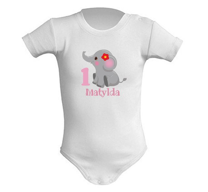 Body na roczek Słonik dla dziewczynki z milutkim szarym słonikiem z czerwonym kwiatuszkiem. Obok słonika jest różowa cyfra jeden, a pod spodem imię dziecka.