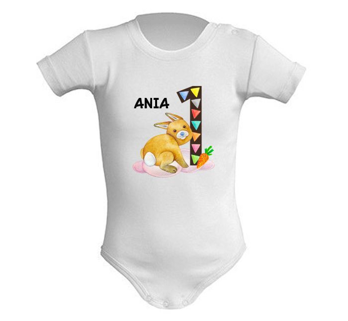 Body na roczek Zajączek dla chłopca i dziewczynki. Zajączek jest w miodowym kolorze i przycupną na leciutkiej chmurce tuż przy jedynce ozdobionej kolorowymi trójkącikami. Tuż na cyfrą leży apetyczna marcheweczka.