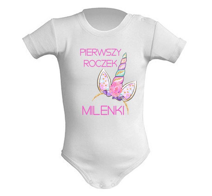 Body Pierwszy Roczek z ozdobą z rogiem jednorożca. Wzór dla dziewczynki. Śliczny pastelowo cukierkowy wzór wpadnie w serce każdej królewny. Mama nie będzie miała kłopotu, aby ubrać dziecko w tak piękne body na roczek. Na body u góry jest napis Pierwszy roczek, a na dole widnieje imię dziecka. Podaj je przy zakupie zanim włożysz produkt do koszyka. Pole do podania imienia jest w zakładce personalizuj. Po środku są ozdobne uszka jednorożca z kręconym rogiem.