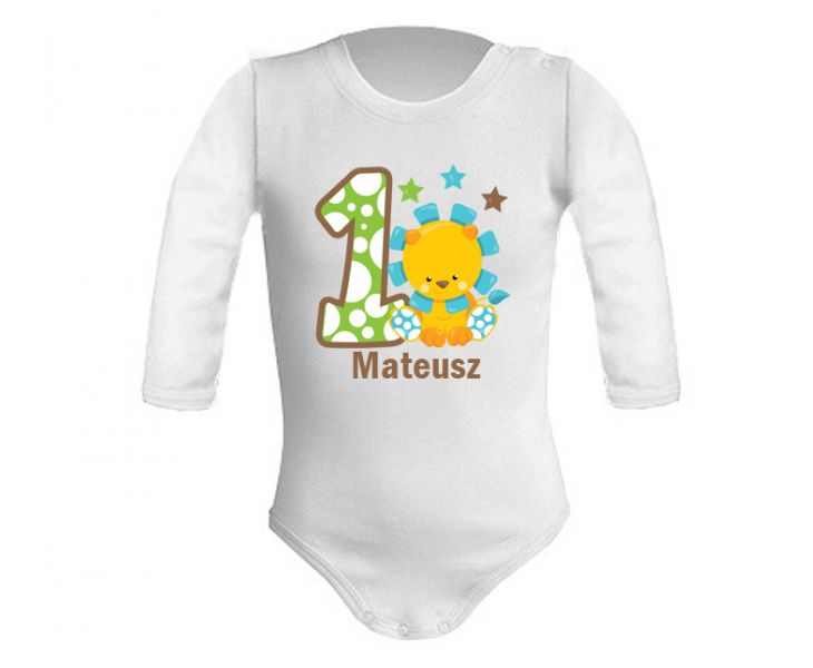 Body na roczek dla chłopca z jedynką oraz imieniem chłopca. Lew ma żóty kolor i jest w pozycji siedzącej. Grzywa jest niebieska, tak samo jak ogonek i stopy lewka. Jedynka natomiast jest duża i zielona w białe kropki. Grafika na body jest bardziej odpowiednia płci męskiej. Roczek to wyjątkowy czas. Od tych urodzin wiek liczy się w latach.