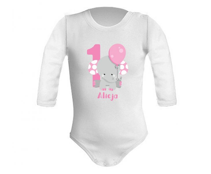 Body na roczek Słonik dla dziewczynki. Śliczny jasno szary słonik trzyma w trąbie różowy balonik. Na body widnieje smukła jedynka. Pod grafiką jest wydrukowane imię dziecka. Koniecznie podaj je w zakładce "Personalizuj". Body niemowlęce ma delikatną, dziecięcą grafikę.