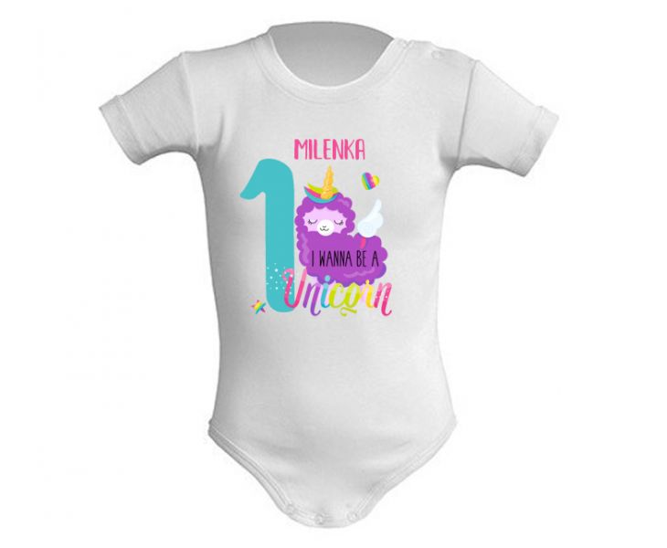 Body na roczek dla dziewczynki z imieniem i lamą. Urodzinowe body na pierwsze urodziny dziewczynki. Na body jest fioletowa lama jednorożec. Lama ma kolorową, tęczową grzywę oraz złoty kręcony róg. Jak każdy jednorożec tan również ma skrzydła. Całość przyozdania napis I wanna be a unicorn, co znaczy, chcę być jednorożcem. Jest kilka tęczowych elementów, które rozweselają cały projekt: Mamy tu gwiadkę, serduszko, grywę oraz napis unicorn. Obok lamy jest cyfra jeden, która wskazuje ile dziecko skończyło lat. Nad obrazkiem jest imię dziecka. grafika jest bardzo urocza i dziewczęca. Na pewno spodoba się małej solenizantce.