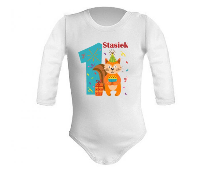 Body na roczek dla chłopca z imieniem i wiewiórką. Body ma wesoły i dziecięcy nadruk. Na urodzinowej grafice jest wszystko co powinno się znależć. Mamy duż i wyraźną cyfrę jeden, imię solenizanta oraz urodzinową grafikę. Pomarańczowa wiewiórka w łapkach coś trzyma. Czy to jest ciasto czy kolejny prezent? To wie tylko ona. Obok wiewiórki jest duży prezent owinięty w pomarańczowy papier ze wzorkami. To będzie świetna zabawa. Niebieska jedynka jest cała obsypana kawałkami serpentyn. U góry body jest imię dziecka. Podaj je przy zakupie.