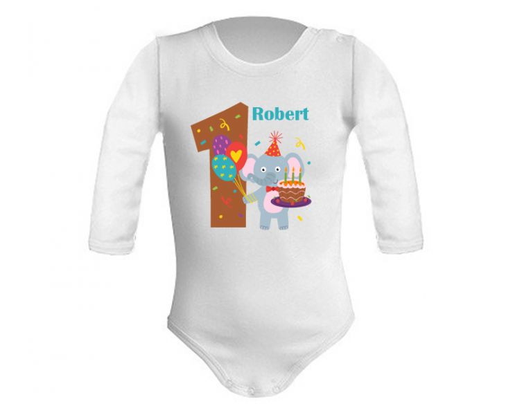 Body na roczek dla chłopca z imieniem i słonikiem z balonami