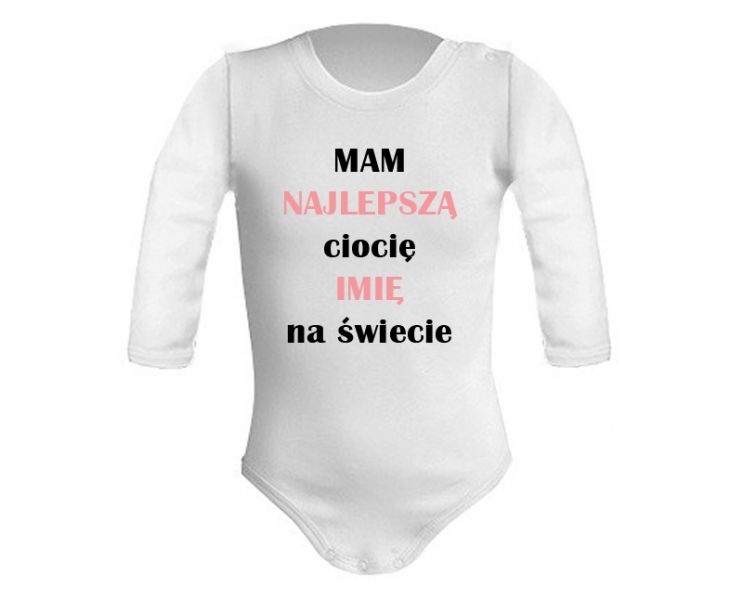 Body Mam Najlepszą Ciocię na świecie dla dziewczynki lub chłopca. Body posiada nadruk w dwóch kolorach. Wyszczególnione jest imię cioci oraz slowo Najlepsza. Dziewczynce będzie pasował kolor różowy. Jeśli kupujesz dla chłopca kolor nadruku można zmienić np. na niebieski.
