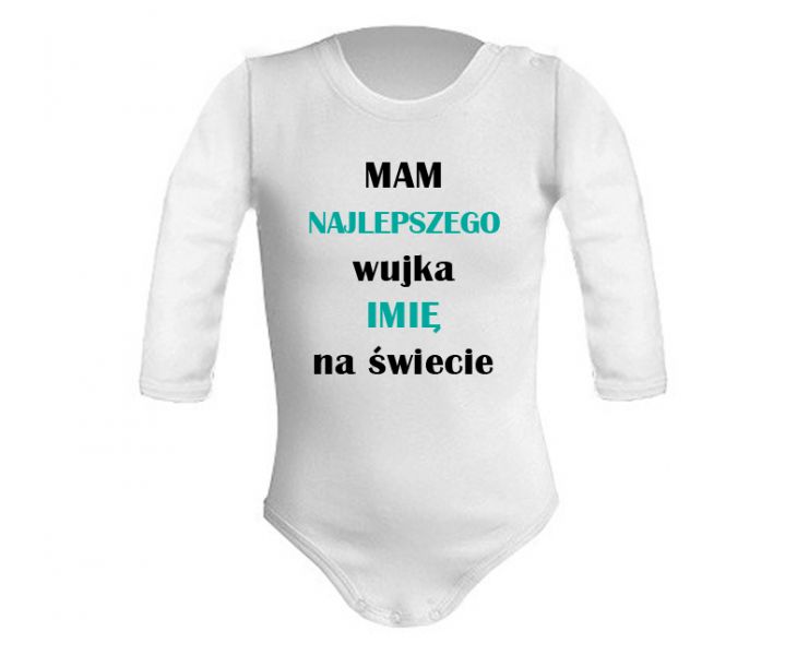 Body Mam Najlepszego wujka (imię) na świecie dla dziewczynki lub chłopca. Body posiada nadruk w dwóch kolorach. Wyszczególnione jest imię wujka oraz slowo Najlepszego. Jeśli kupujesz body dla chłopca kolor na niebieski będzie pasował. Dziewczynce możesz zmienić kolor na różowy.