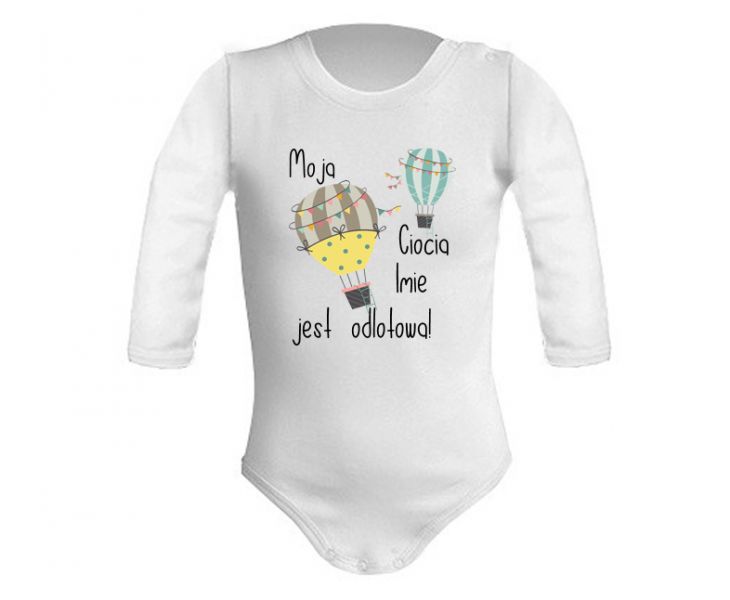 Body od cioci dla chłopca Moja ciocia jes odlotowa. Body niemowlęce z nadrukiem balonów z koszami oraz z napisem. Jeden balon jest kolorze żółtym w zielone kropki w dolnej części od góry jest w pionowe paski brązowe i beżowe. Kosz jest ciemno grafitowo brązowy. Drugi balon jest niebieski w pasy w dwóch odcieniach.