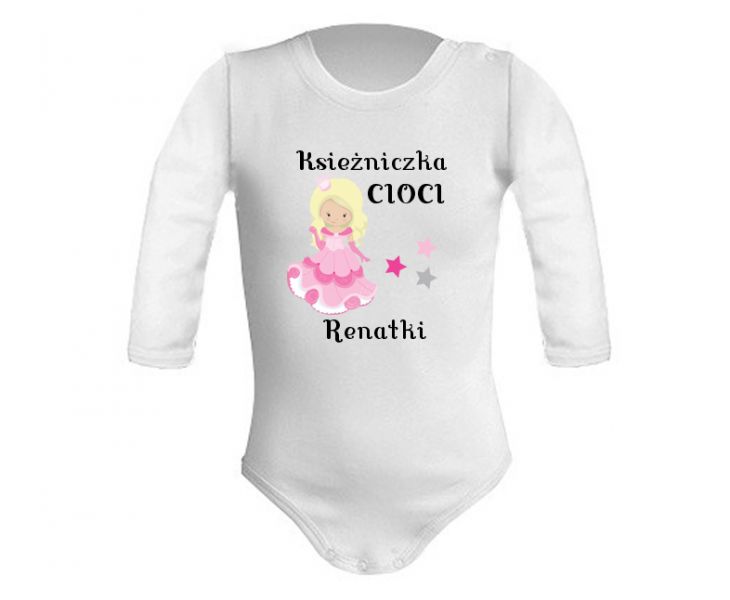 Body Księżniczka cioci spersonalizowane jest imieniem cioci, która wręcza tak piękny prezent. Na grafice jest piękna mała królewna w balowej różowej sukni. Body jest bardzo dziewczęce. Nadruk jest miękki i bezbieczny dla niemowląt. To body od cioci łączy ze sobą kilka zalet. To wesoły i śliczny prezent od cioci oraz praktyczne ubranie dla dziecka i mamy.