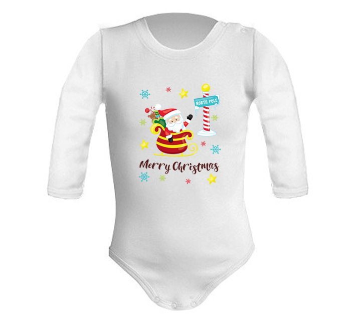 Świąteczne body ze świętym Mikołajem w saniach, który ma worek pełen prezentów to typowy bożonarodzeniowy wzór. Na biegunie północnym pada śnieg i prószy na sanie świętego Mikołaja. I choć jest mroźno, to jednak pięknie i klimatycznie.
