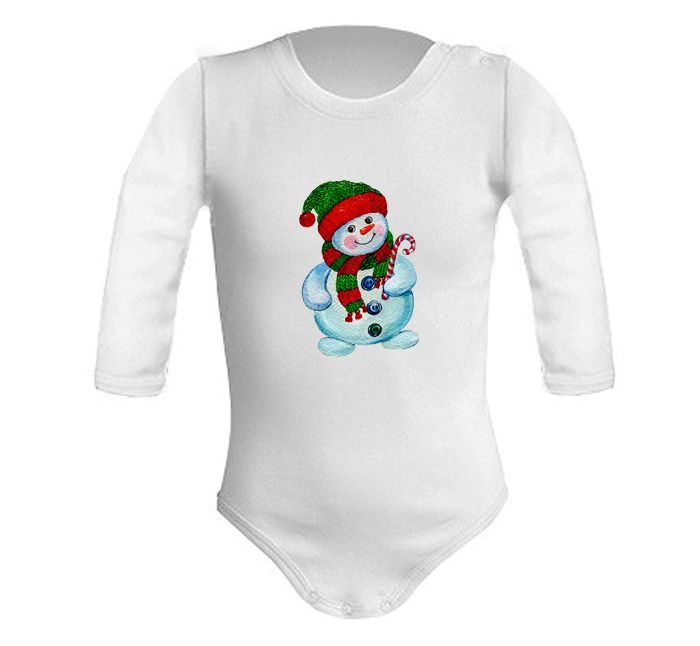 Body świąteczne Bałwanek w Szaliku jest fajną propozycją na zimowy czas. Bałwanek jest jak namalowany. Jest blado niebieski, na głowie na czerwono-zieloną czapkę, a jego szyję otula długi szaliczek w kolorach czapki. Jest uśmiechnięty. Ma charakterystyczny nosek z marchewki, oczy czarne jak z węgielków. W ręce trzyma cukrową laskę.