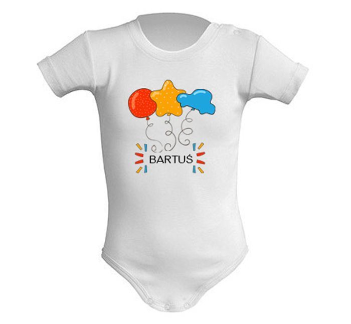 Body chłopience z balonikami oraz imieniem dziecka. Body zdobi czerwony okrągły balonik, żółty w kształcie gwiazdki oaz niebieskiego samochodzika. Pod balonikami widnieje imię dziecka i konfetti.