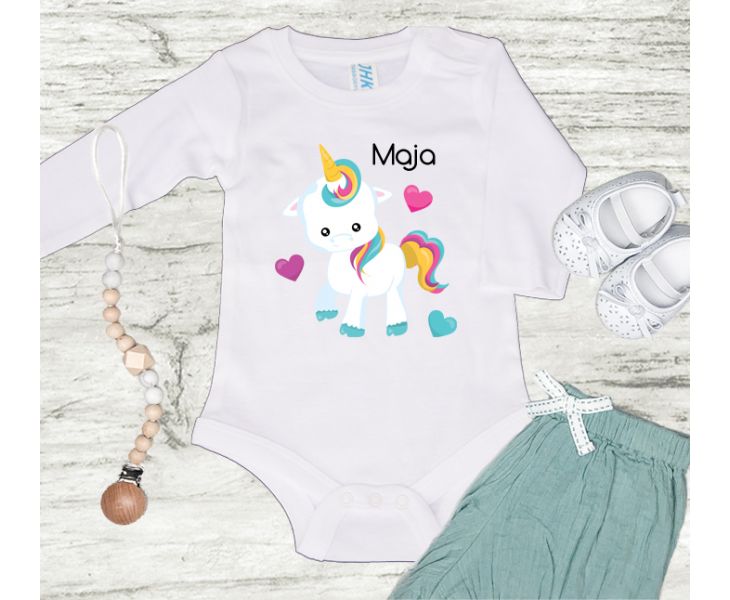 Body z imieniem dziecka Jednorożec. Body dla dziewczynki z bardzo uroczym nadrukiem jednorożca. Do okoła niego wirują trzy serca w kolorze niebieskim, różowym i fioletowym, Jednorożec jest biały. Ma niebieskie kopyta oraz tęczowy ogon i grzywę. Na głowie jest przytwierdzony złotawo-żółty róg. Grafika jest bardzo słodka i zachwycająca. Każda mała dziewczynka będzie nią zachwycona. Nad jednorożcem jest nadrukowane imię dziecka. Na body jest tylko przykład, więc koniecznie podaj właściwe imię do nadruku. Możesz je zapisać w zakładce personalizuj lub w koszyku w komentarzu do zamówienia.