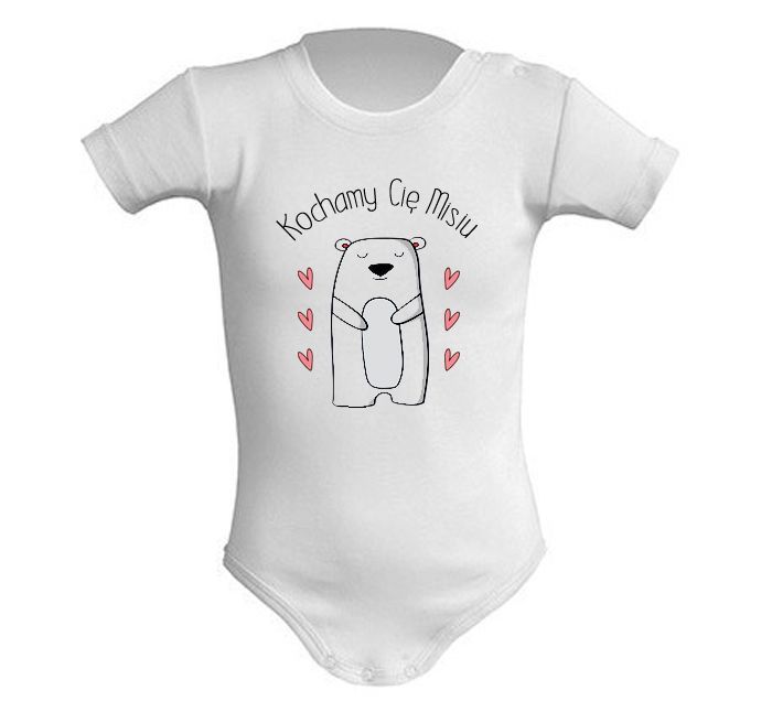 Body Kochamy Cię Misiu dla małego chłopca. Bodziak dosyć neutralny, ale raczej pasuje płci męskiej. Mały biały miś ma zamknięte oczka i wygląda jakby spał. A sen to jest ulubiona aktywność małych dzieci. Misiu otoczony jest serduszkami.