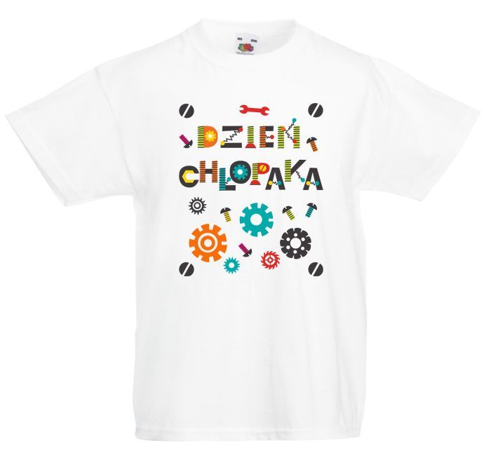Koszulka na dzień chłopaka z kolorowym robotycznym napisem.