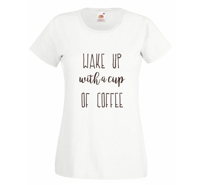 Koszulka damska Wake up with a cup of coffee z kolekcji Coffee zaprasza na poranną kawę. Kawa zbożowa dla dzieci czy kawa prawdziwa z cofeiną czy bez dla dorosłych zawsze dobra na przywitanie dnia :).