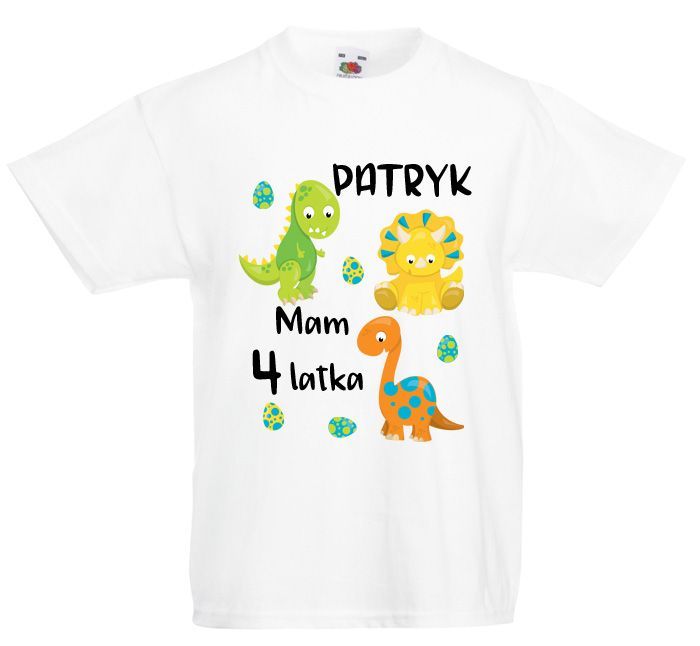 Koszulka na cztery latka z małymi dinusiami. Podaj imię do nadruku w zakładce: "Personalizuj". Jeśli nie chcesz imienia, poproszę napisz to. To są przykładowe kolory koszulek na których nadru ładnie się prezentuje. Możesz zmienić kolor na: róż, granat, błękit, niebieski lub żółty.