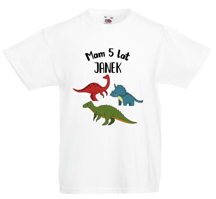Koszulka urodzinowa 5 z dinozaurami. Podaj imię do nadruku w zakładce: "Personalizuj". Jeśli nie chcesz imienia, poproszę napisz to.
