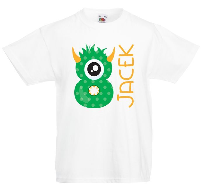Koszulka dziecięca z imieniem oraz zieloną ósemką z oczami. Ósemka jest przeznaczona dla chłopca i dla dziewczynki, bo każdy wszakże kiedyś kończy osiem lat. Koszulka na ósme urodziny dziecka. W propozycjach jest kolor biały i niebieski. Możesz go zmienić i wybrać ulubiony kolor dziecka. Napisz przy zakupie prośbę o zmianę koloru koszulki.