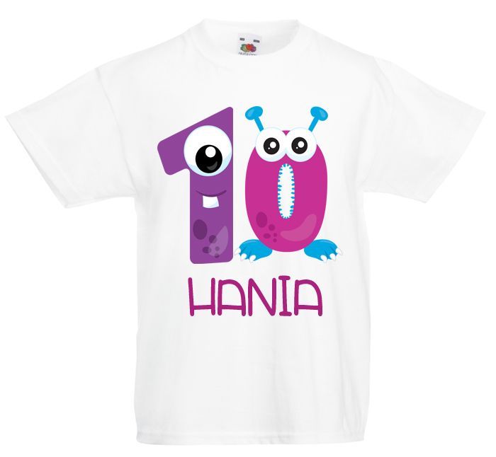 Koszulka dziecięca z imieniem oraz dziesiątką z oczami. Dziesiątka jest przeznaczona dla chłopca i dla dziewczynki, bo każdy wszakże kiedyś kończy dziesięć lat. Koszulka na dziesiąte urodziny dziecka. W propozycjach jest kolor biały i różowy. Możesz go zmienić i wybrać ulubiony kolor dziecka. Napisz przy zakupie prośbę o zmianę koloru koszulki.