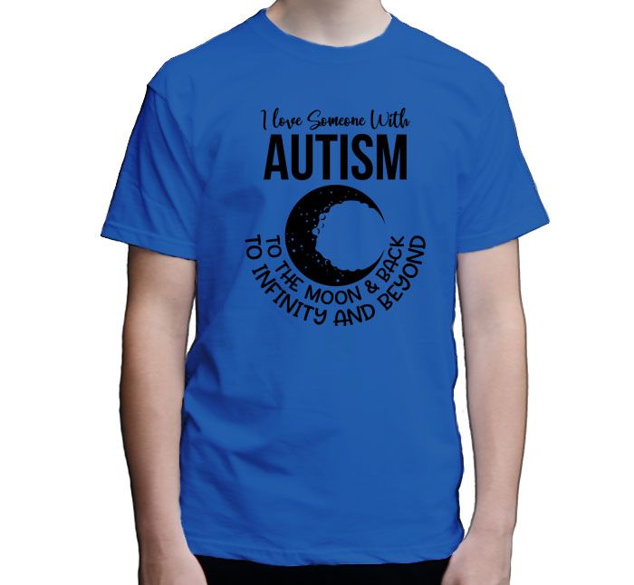 Koszulka Kocham kogoś z autyzmem, a w wersji angielskiej I love someone with autism. Koszulka niebieska z zarysem księżyca.