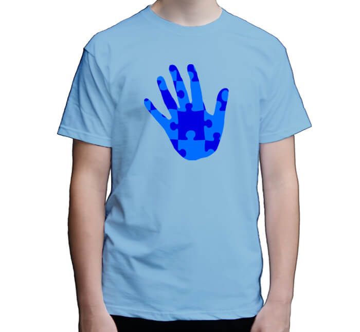 Koszulka Autyzm Dłoń z puzzli jest gotowa do drogi, ale również do wszelkich modyfikacji. Do tej puzzlowej ręki możesz dodać dowolny napis. Wszystko jest utrzymane w niebieskim kolorze.