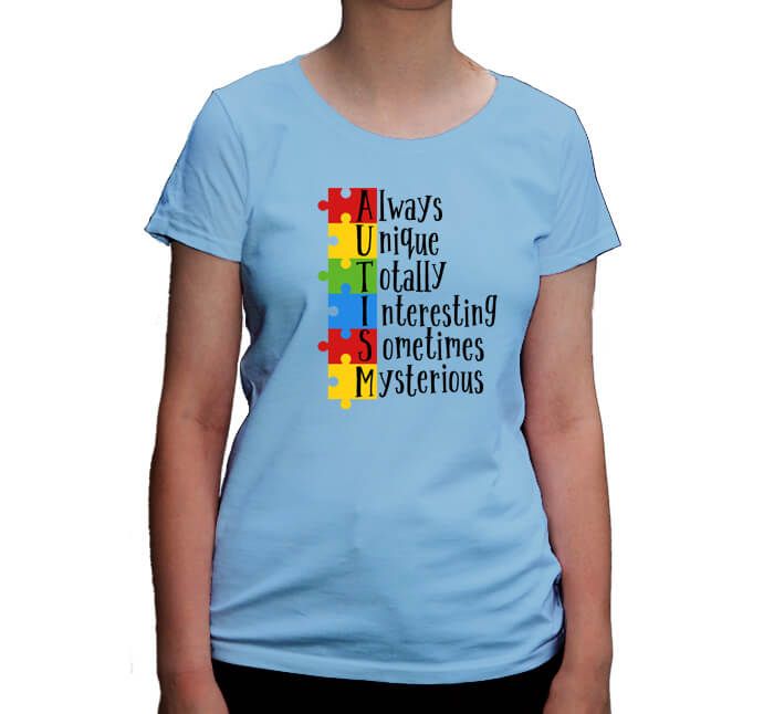 Koszulka Always unique Totally interesting Somethimes misterious jest przygotowana w celu propagowania świadomości czym jest autyzm. Tekst jest w języku angielskim. Symbolem solidarności z osobami z autyzmem jest kolor niebieski.
