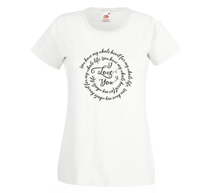 Koszulka z pięknym i oryginalnym nadrukiem. Cudowna sentencja ułożona wokół słów I love you. Ciekawy design.