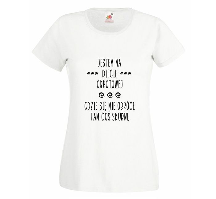 Koszulka Jestem na diecie obrotowej, gdzie się nie obrócę tam coś skubnę. Jeśli u Ciebie również leży w każdej szafce coś dobrego, to trudno się powstrzymać. Dobrze jest brzuszkowi fundować 3 godzinne przerwy w jedzeniu. Odpoczynek od trawienia jest niezwykle bezcenny. Przecież wcale człowiek nie jest ciągle głodny, to tylko łatwa dostępność do przekąsek sprawia, że podjadanie stało się problemem.