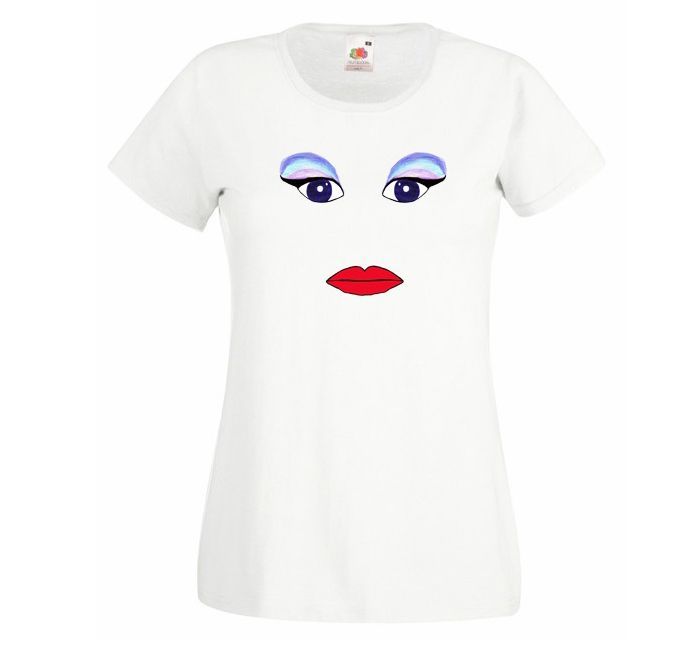 Bawełniana koszulka damska z nadrukowanymi oczami z kolorowym makijażem oraz czerwonymi ustami.