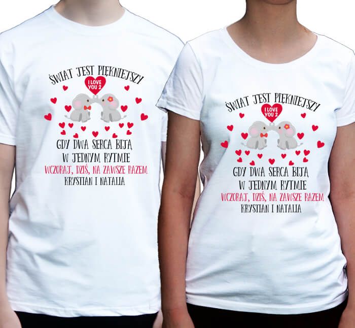 Koszulki dla pary Świat jest piękniejszy, gdy dwa serca biją w jednym rytmie.