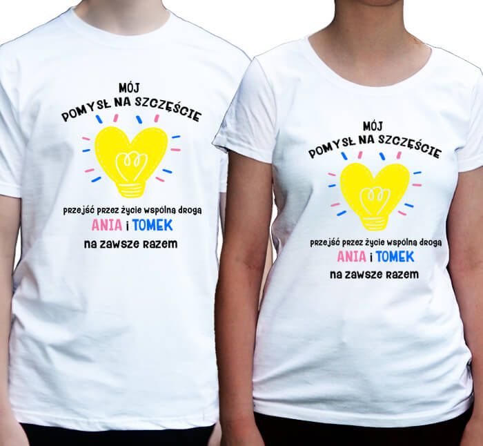 Koszulki walentynkowe Mój pomysł na szczęście: przejść przez życie wspólną drogą. Koszulki spersonalizowane imionami pary.