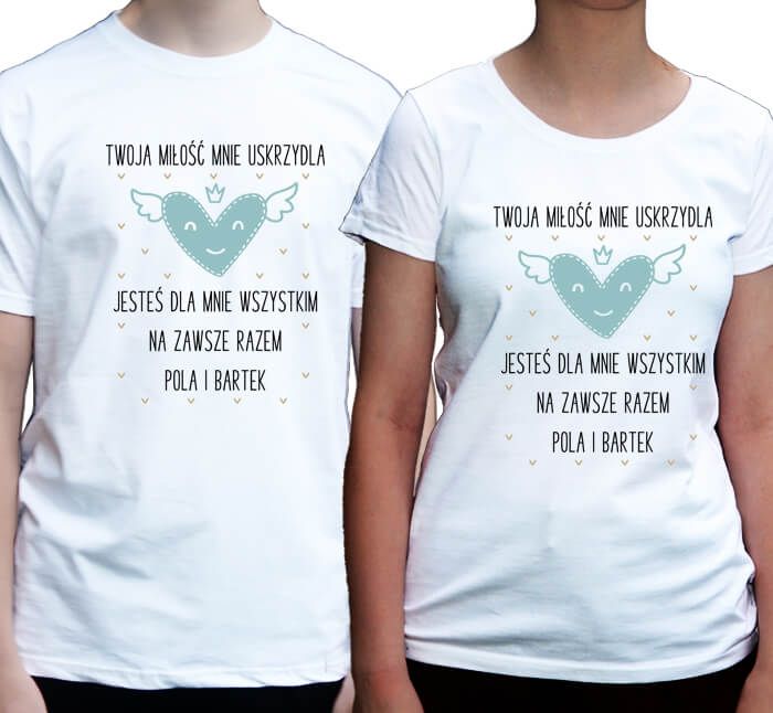 Koszulki dla pary Twoja miłość mnie uskrzydla. Jesteś dla mnie wszystkim. Koszulki spersonalizowane imionami pary.