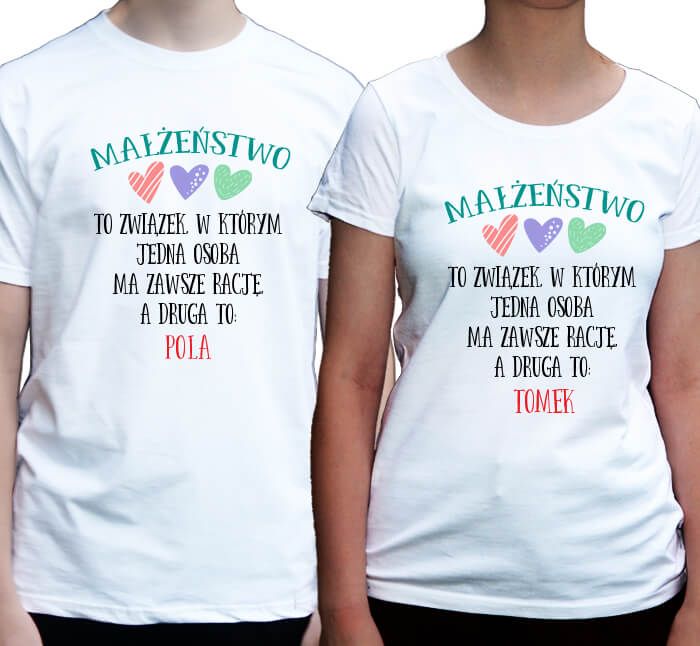 Koszulki dla pary Małżeństwo to związek, w którym jedna osoba ma zawsze rację, a druga to: (wpisz imię swojej połówki). Koszulki personalizowane.