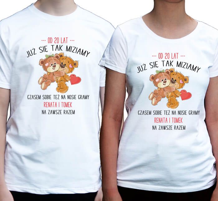Koszulki dla par na rocznicę z misiami, które się słodko przytulają. Spersonalizuj własnymi danymi.