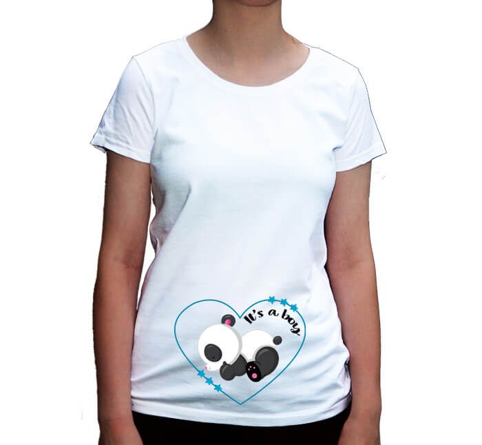 Koszulka ciążowa It's a boy z małą śpiącą pandą. Koszulka ma nadruk na dole koszulki gdzie rośnie mała dzidzia i powiększa się brzuszek. W obrysie serduszka ozdobionego gwiazdeczkami śpi mała panda. Mały słodki miś jak małe słodkie dziecko.