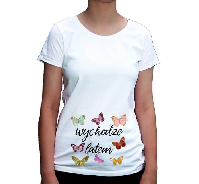 Koszulka Wychodzę latem to propozycja dla mam w ciąży, których termin rozwiązania przypada na letnie miesiące. Koszulka jest wyjątkowa i niepowtarzalna. Nadruk jest przeniesiony nisko na brzuszek, co ładnie podkreśla ten wyjątkowy stan. Motylki na grafice są jak żywe. Dokładnie widać błonki na skrzydłach motyli. Każdy jest inny.