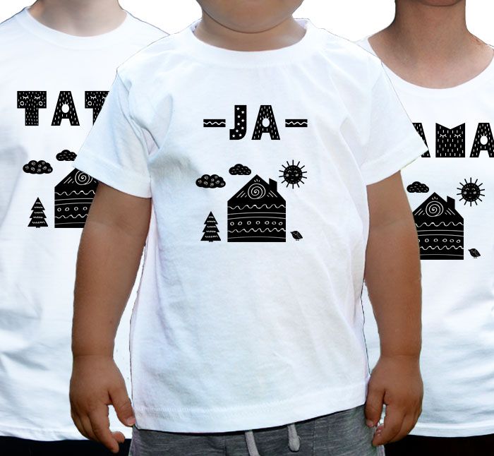Koszulki rodzinne Domek. Zestaw koszulek dla rodziny z przedstawionym domkiem i jego otoczeniem. To taki okolicznościowy obrazek jaki maluje każde dziecko.