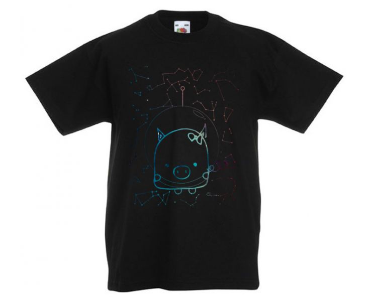 Świnka z kasku astronauty dryfuje pośród gwiazd. Koszulka dla dzieci z gwiezdnym nadrukiem pokazuje różne kosmiczne konstelacje. Świnka jest zadowolona i ma wesołą minkę.
