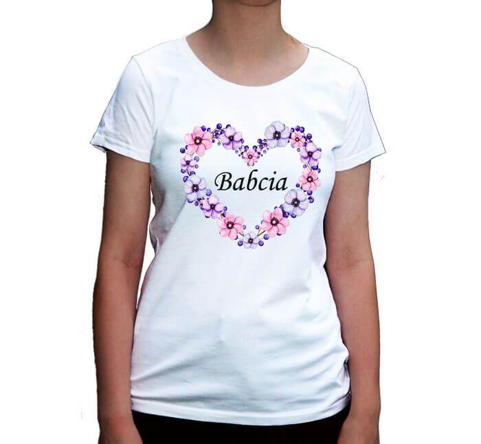 Koszulka z sercem dla babci ozdobi uśmiechem obdarowaną osobę. Piękny nadruk fioletowych kwiatów wgląda bardzo bogato. Z kwiatów o bardzo delikatnych płatkach ułożony jest wianek w kształcie serca.