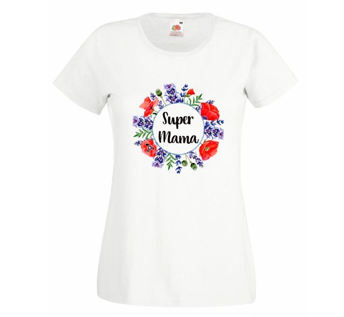 Koszulka z wiankiem Super Mama. Winek ułożoany z pięknych czerwonych i fioletowych kwiatów.