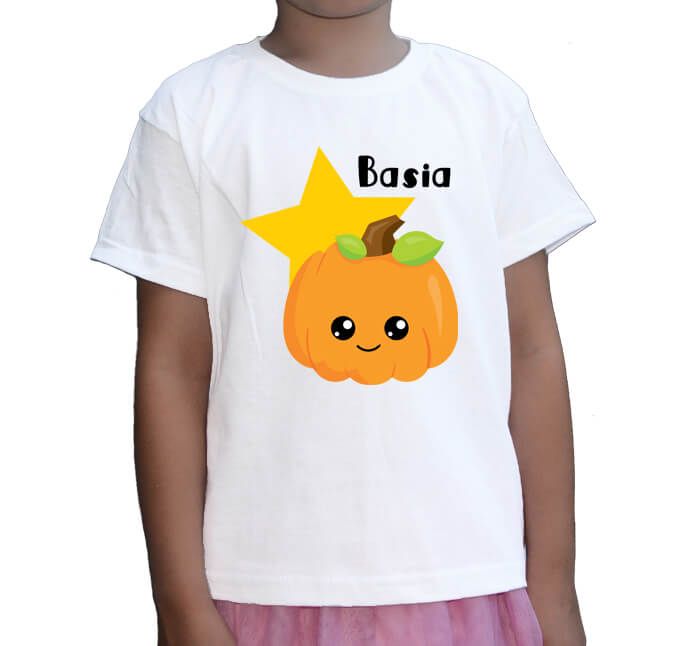 Koszulka Dynia z gwiazdką z imieniem dziecka. Koszulka z dynią podkreśla jesienny charakter stylizacji. Dynie dojrzewają pod koniec października i wtedy królują we wszystkich aranżacjach.