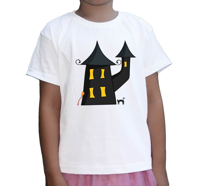 Koszulka Domek czarownicy Koło domku chodzi czarny kotek. O jedną ze śnian oparta jest zaczorowana miotła. Domek ma nietypowy kształt.