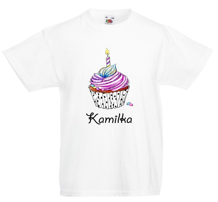 Koszulka urodzinowa z imieniem i babeczką z okazji pierwszych urodzin dziecka.